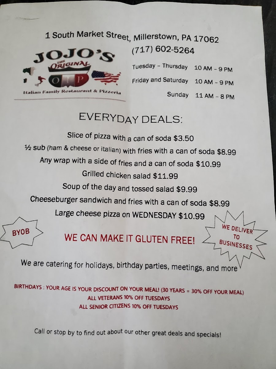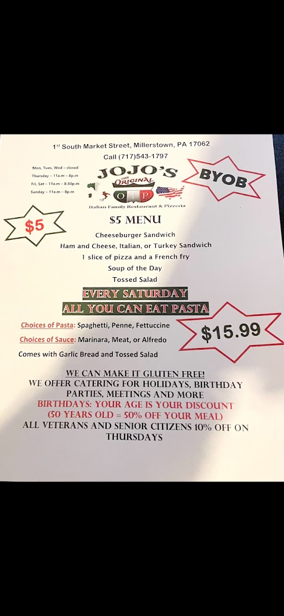 Welcome to Jojo's Original Italian Pizza, nestled in the heart of Millerstown, PA. This cozy eatery is a testament to authentic Italian cuisine, where every dish is crafted with love and tradition. From the moment you step inside, you are embraced by a warm, homey atmosphere, making it feel like a true Italian oasis.